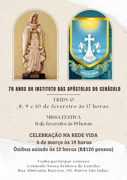 Para marcar os 70 anos de fundação, as Irmãs Apóstolas do Cenáculo programaram um tríduo nos dias 8, 9 e 10 de fevereiro, sempre às 17 horas, seguido de Missa Festiva no dia 11 de fevereiro, às 19 horas. As celebrações serão realizadas na Capela do Cenáculo Nossa Senhora de Lourdes, na Rua Almirante Barroso, 151, bairro São Judas, em Piracicaba. No dia 6 de março, às 19 horas, haverá ainda celebração transmitida pela Rede Vida de Televisão; para essa atividade, um ônibus sairá do Cenáculo às 12 horas, com custo de R$ 120,00 por pessoa.